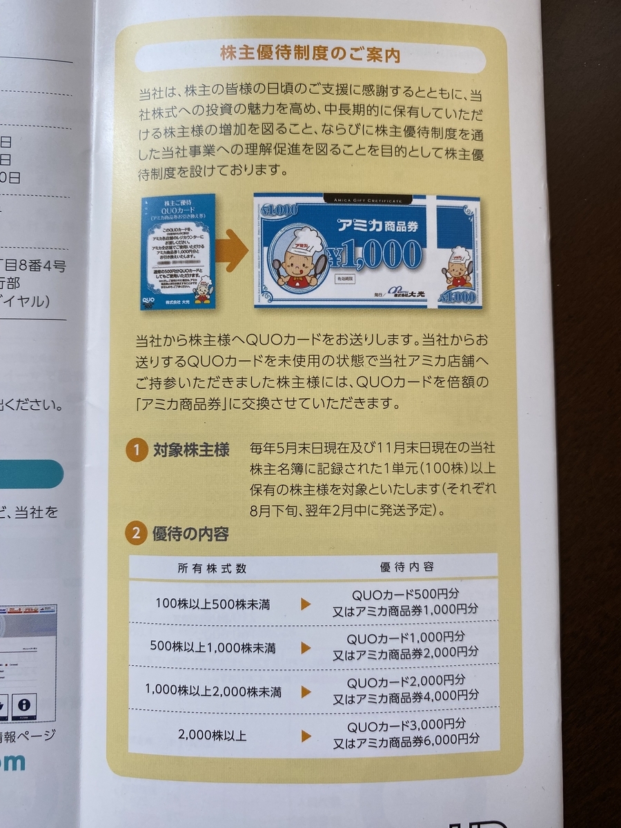 2024-02-25 【株主優待】大光 24-① 株主優待 2024年に頂いた最初の株主優待は 【3160 大光】のQUOカードでした 年2回も頂けるありがたい優待です 500円のQUOカードは店舗で1,000円のお買物券に交換してもらえるので 年間2,000円分の株主優待です 現在の株価は630円なので優待利回りは3.17%になります 配当金は11円で1.75% 総合利回りは4.92%です 近くに店舗があるならお勧めしたい銘柄ですね にほんブログ村 にほんブログ村